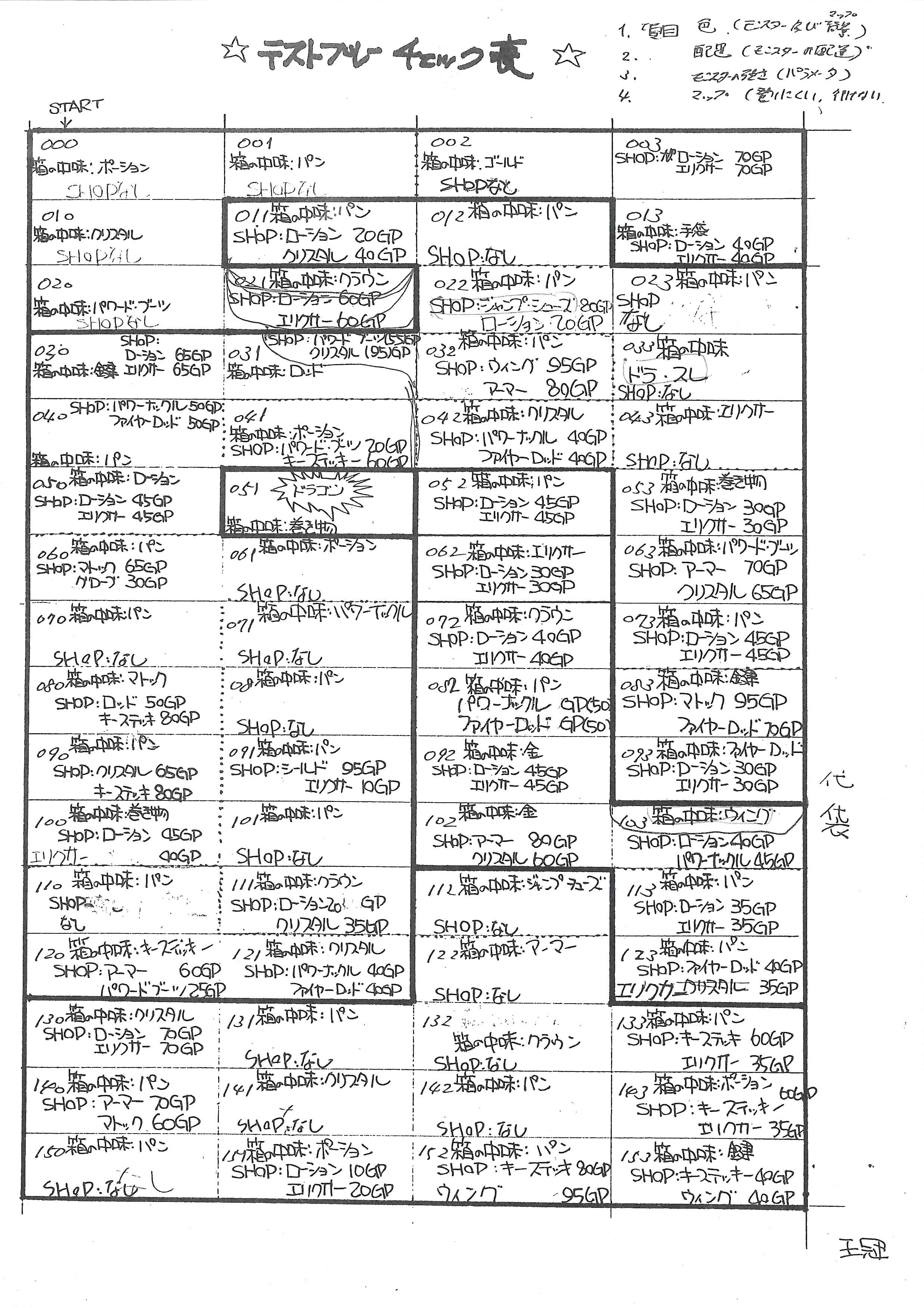 テストプレーで、マップ内エリアごとの宝箱の中身・SHOPの売り物と値段をチェックするリストと思われる。