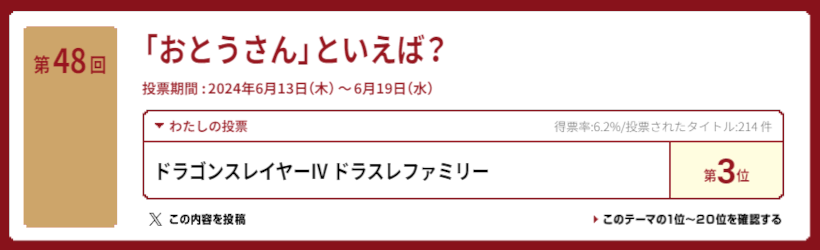 任天堂公式アンケート「ファミコン国民投票」第48回「おとうさんといえば?」にて3位を獲得。