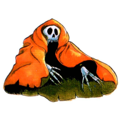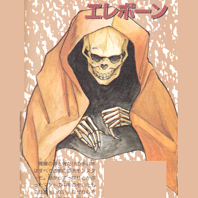 It is a giant monster that is transparent in all but the head of a skull and the hands of a bone. No one peeped into the cloak that it wore over it's head. Because, all who were wrapped in that cloak did not return. Therefore, it is rumored that there is only death packed in it. The way he chases down the fleeing opponent is like the Grim Reaper itself.髑髏の頭と骨だけの手以外はすべて透明の巨大モンスターだ。頭からすっぽりとかぶったマントの中をのぞいたものは誰もいない。なぜならそのマントに包まれた者はすべて帰ってこなかったからだ。したがって、その中にはただ死だけが詰まっているといわれている。逃げる相手をジワジワと追いつめる様子は、死神そのものだ。