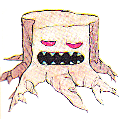 It's a monster that is the stump of a sacred tree that has lived for thousands of years and has been turned into an evil spirit. Some burrow into the ground.何千年も生きてきた神木の切株が悪霊化したモンスター。地に潜るものもいる。