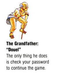 "I am a Dawel. If you let me know the password taught by Geera, You can continue the last time."「ジーラばあさんから教えられたパスワードをこのわし、ドウエルに聞かせてくれれば、前回の続きができるぞ。」