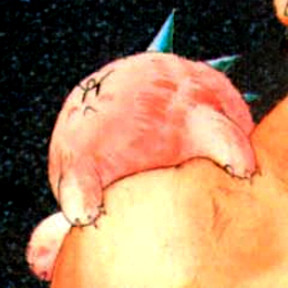 It acts like a dog but is really a monster. The other monsters don't bother Pochi.ふだんは犬の姿をしている。モンスターからのダメージは受けない。