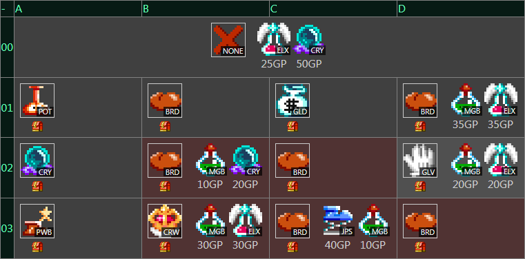 The deepest part of the dungeon is 16 floors below ground, They are numbered A-01, B-01, C-01, D-01, A-02, B-02....D-16 on the map, followed by other rooms exist as EX-01 to 08.ダンジョンの最深部は地下16階です。マップの内部番号がA-01, B-01, C-01, D-01, A-02, B-02...D-16にあたるものに続いた後、それ以外の部屋はEX-01から08として存在します。