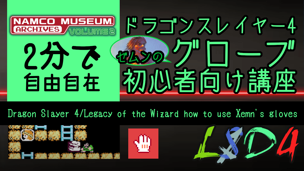 Mainly for those who are new to Legacy of the Wizard (Dragon Slayer 4) in NAMCO MUSEUM ARCHIVES vol. 2. The manual is too simple and does not include how to use Xemn's gloves, which is hard to play.主にNAMCO MUSEUM ARCHIVES vol.2でドラゴンスレイヤー4(Legacy of the Wizard)に初挑戦の人向け。マニュアルが簡素すぎてゼムンのグローブの使い方が載っていないのでつらいと思います。