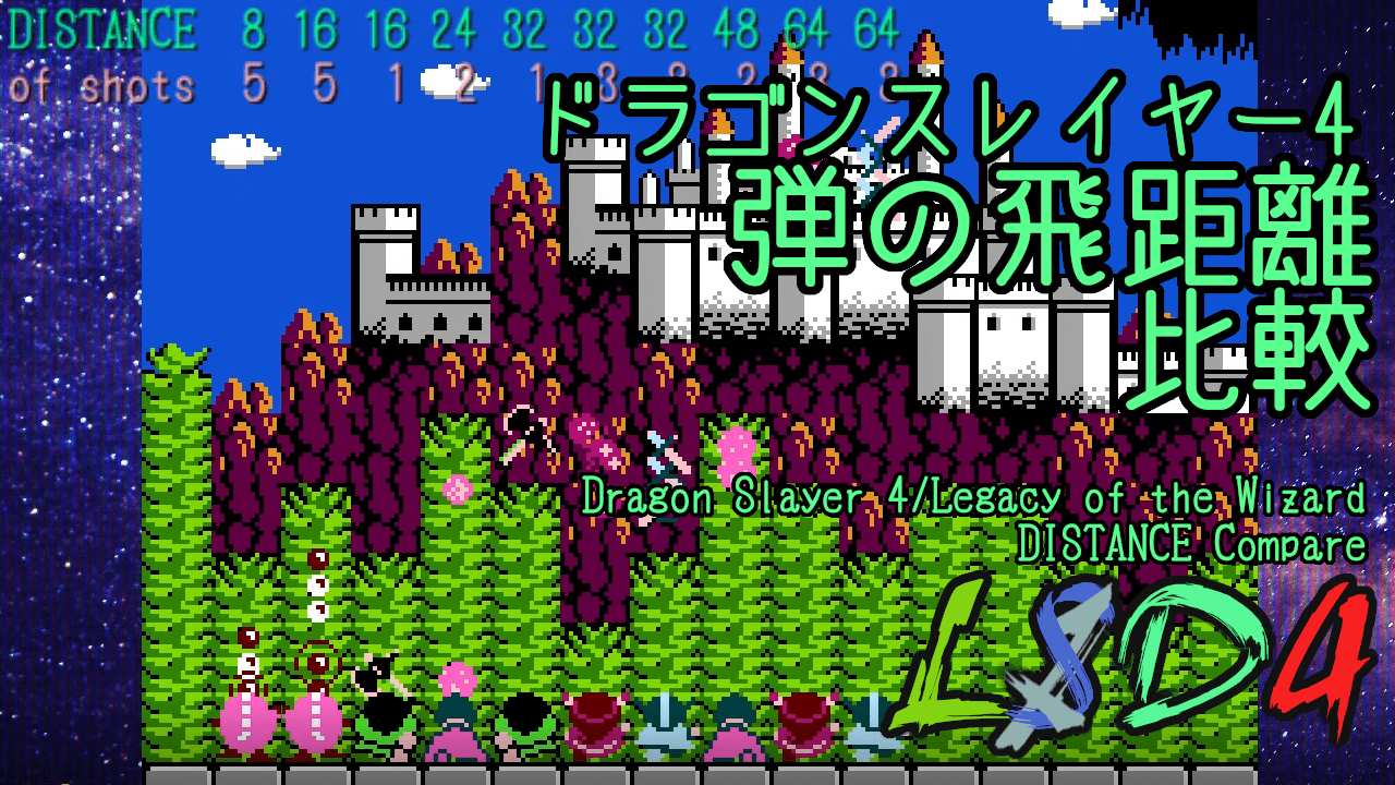 ドラゴンスレイヤー4でプレイヤーキャラクターの弾の飛距離と撃ち尽くすまでの時間を比較しました。全機種で同じ結果になります。