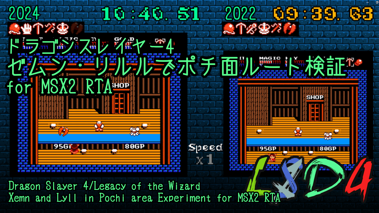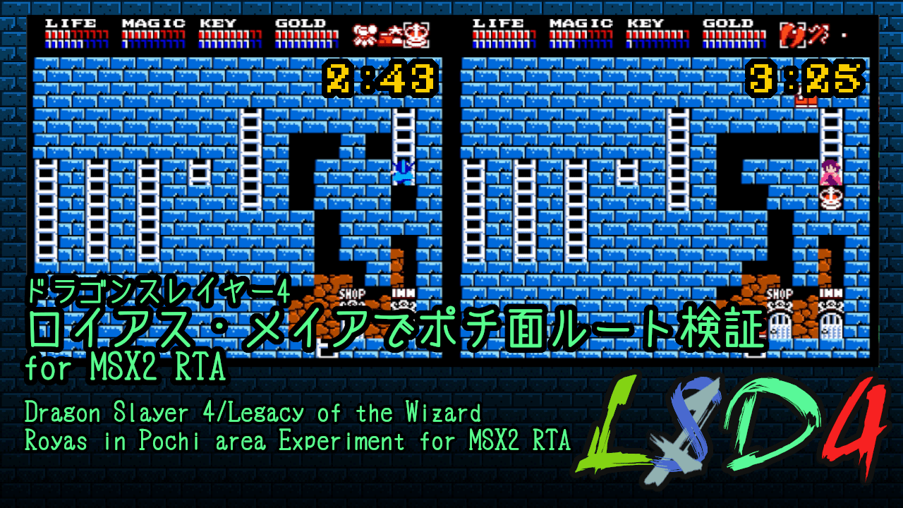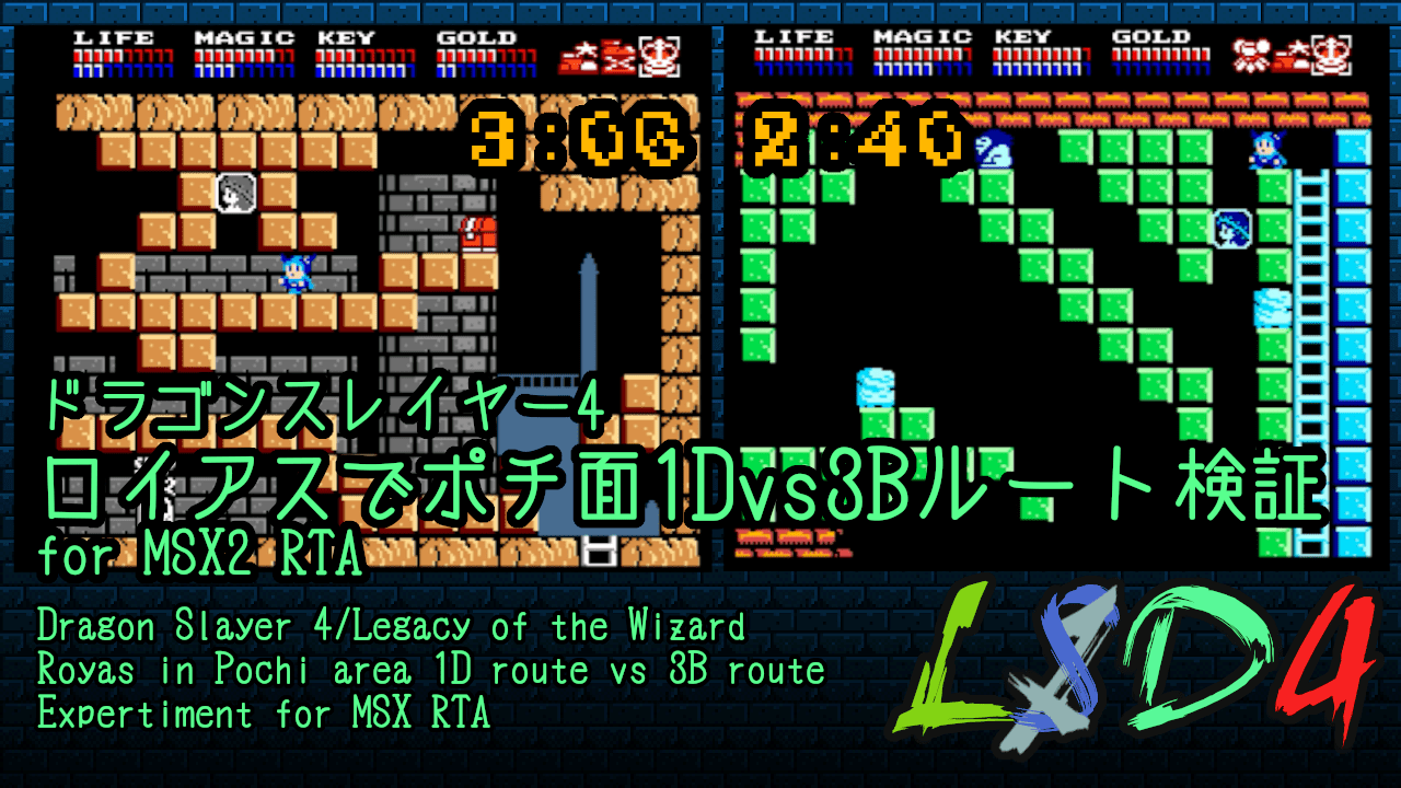 ドラゴンスレイヤー4でMSX2版だけはロイアスが宝冠を1つ持っていればワープが可能になります。それを利用したポチ面1Dルートと3Bルートのタイム差を検証しました。装備アイテムは既に全て確保済みという前提での実験です。