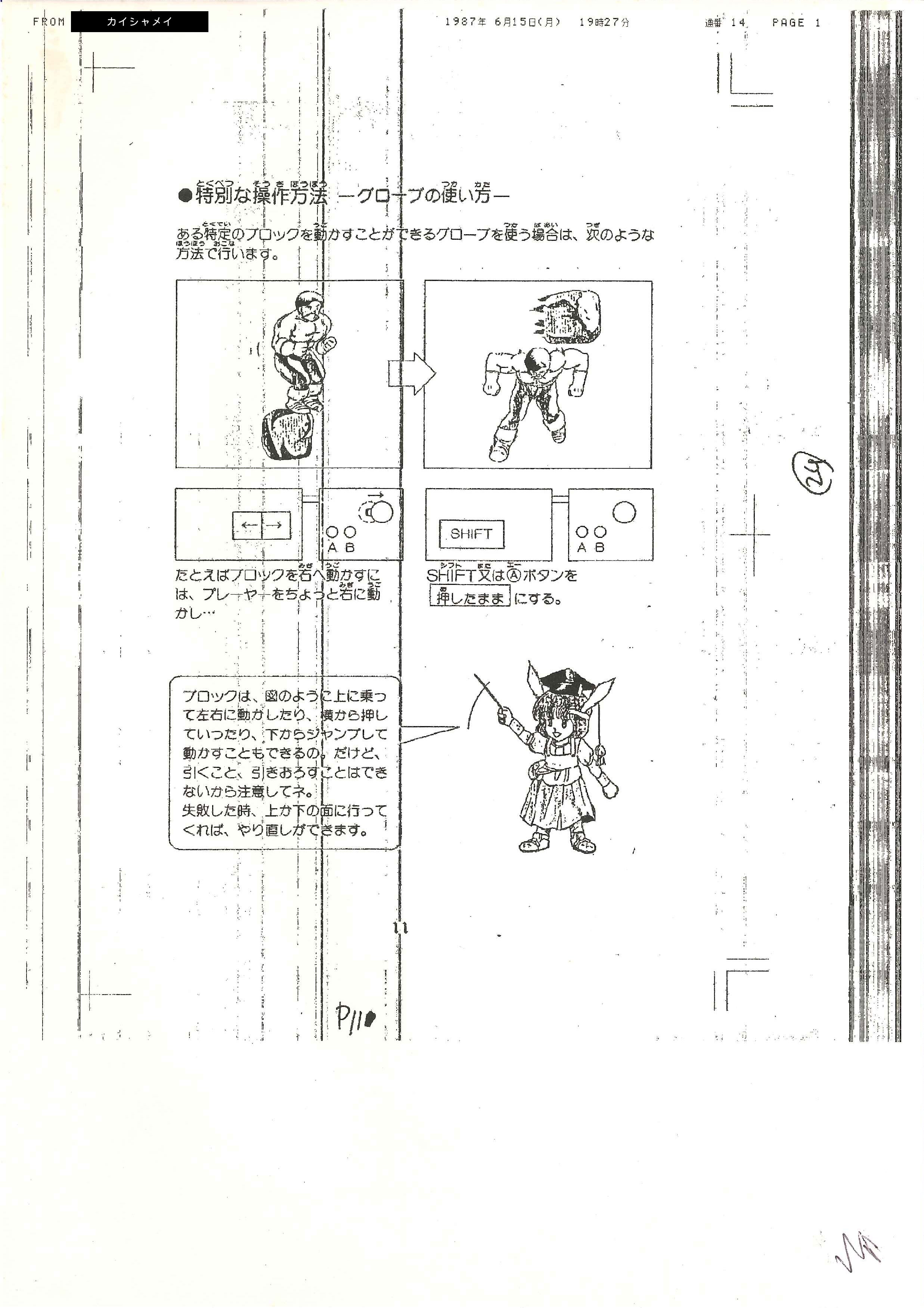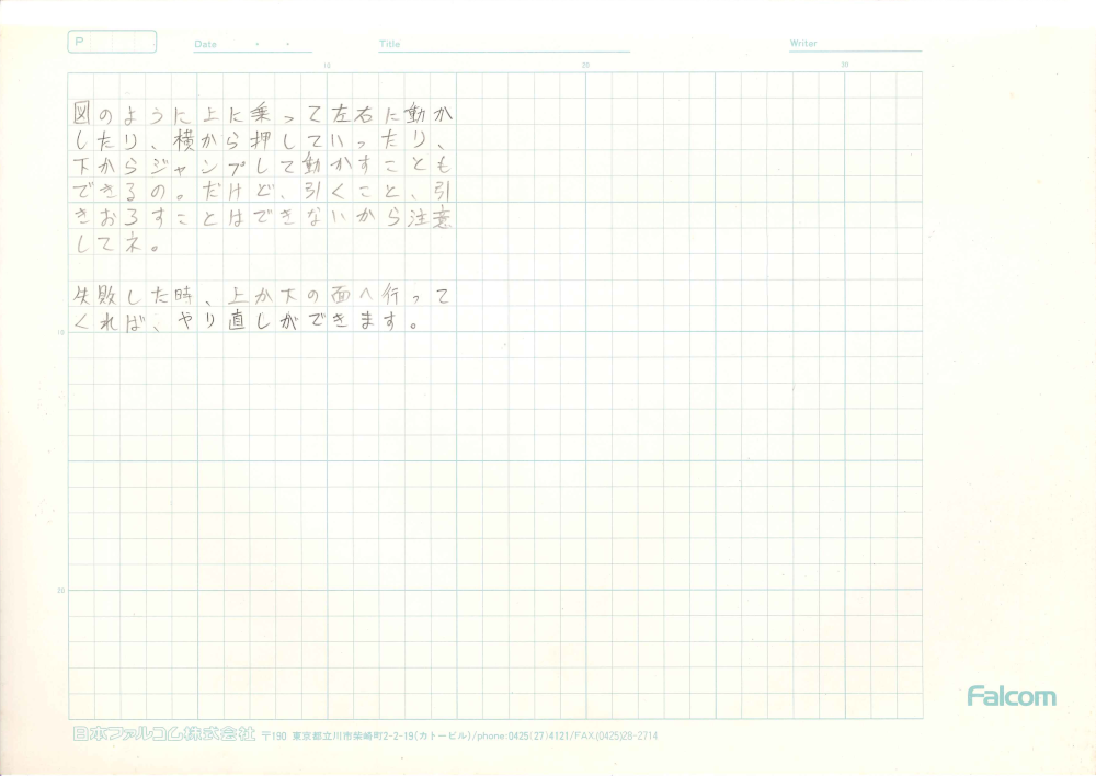 手書き原稿の内容は「図のように上に乗って左右に動かしたり、横から押していったり、下からジャンプして動かすこともできるの。だけど、引くこと、引きおろすことはできないから注意してネ。失敗した時、上か下の面へ行ってくれば、やり直しができます。」
