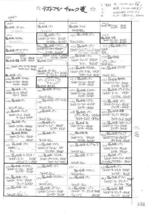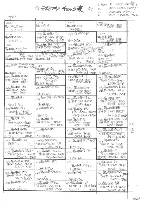 テストプレーで、マップ内エリアごとの宝箱の中身・SHOPの売り物と値段をチェックするリストと思われる。
